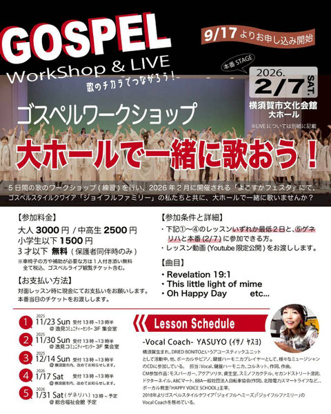 5日間の歌のワークショップ(練習)を行い、2026年2月に開催される「よこすかフェスタ」にて、ゴスペルスタイルクワイア「ジョイフルファミリー」の私たちと共に、大ホールで一緒に歌いませんか?