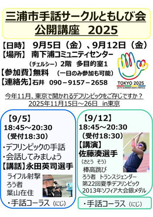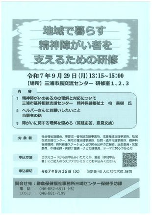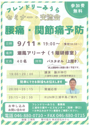 イベント イベント 2025年9月 みうら 不登校・ひきこもりの親の会YouYou 9月6日(土)10:30~12:00/13:00~14:30 場所:ニナイテ研修室 三浦市市制70周年記念 グラウンド・ゴルフ大会参加者募集 9月10日(水) 場所:潮風スポーツ公園 フレンドリーみうらセミナー・交流会 腰痛・関節痛予防 9月11日(木)19:00~ 場所:潮風アリーナ 三浦市手話サークルともしび会公開講座2025 9月5日(金)9月12日(金)18:45~20:30 場所:南下浦コミュニティセンター 三崎合唱会 80周年記念コンサート 9月13日(土)開演14:00(開場13:30) 場所:三浦市民ホール うらり みんなで歌おうさくらの会 9月18日(木) 10:00~12:15/13:30~15:45 場所:横須賀文化会館 大ホール 未就園児おあそび会 9月24日(水)10:30~11:15 場所:ニナイテ研修室 地域で暮らす精神障がい者を 支えるための研修 9月29日(月)13:15~15:00 場所:ニナイテ研修室 過去のイベント一覧を見る ➡ tagPlaceholderカテゴリ: